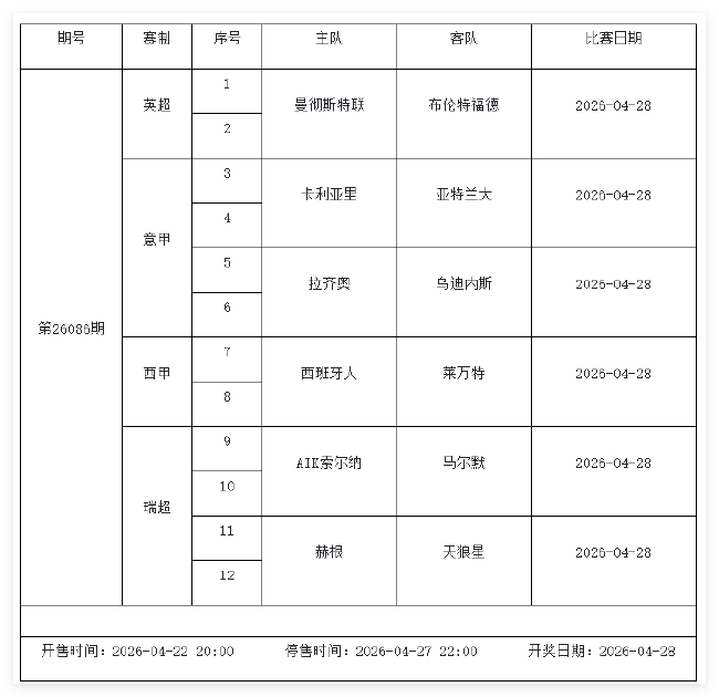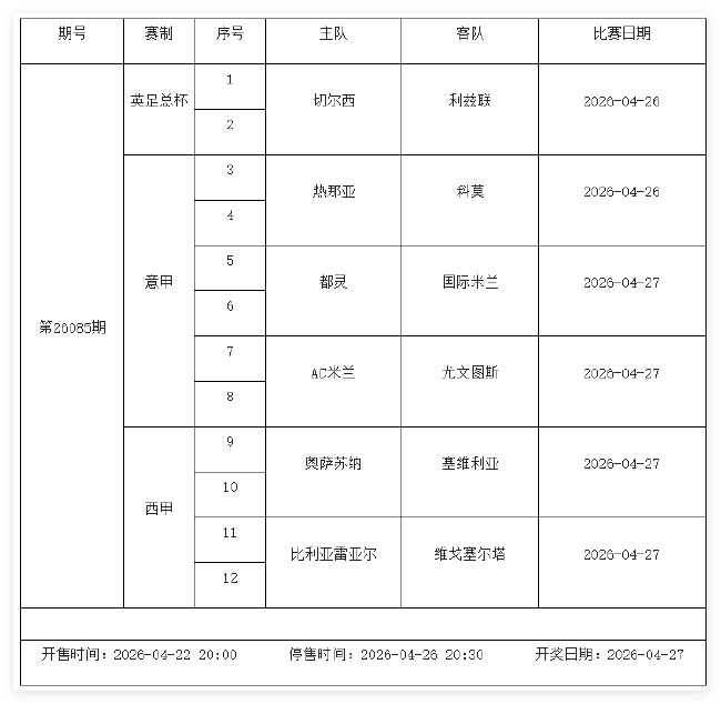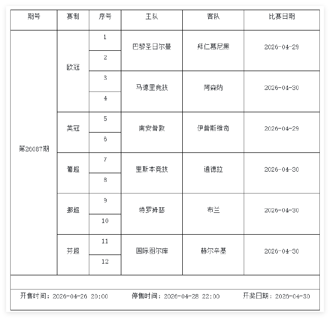 我中心制定了2026年中国足球彩票胜负游戏(14场、任选9场)、6场半全场胜负游戏和4场进球游戏4月24日-4月30日的竞猜场次安排(具体附后),其竞猜对象、开售时间、停售时间和计奖时间均以本文为准。